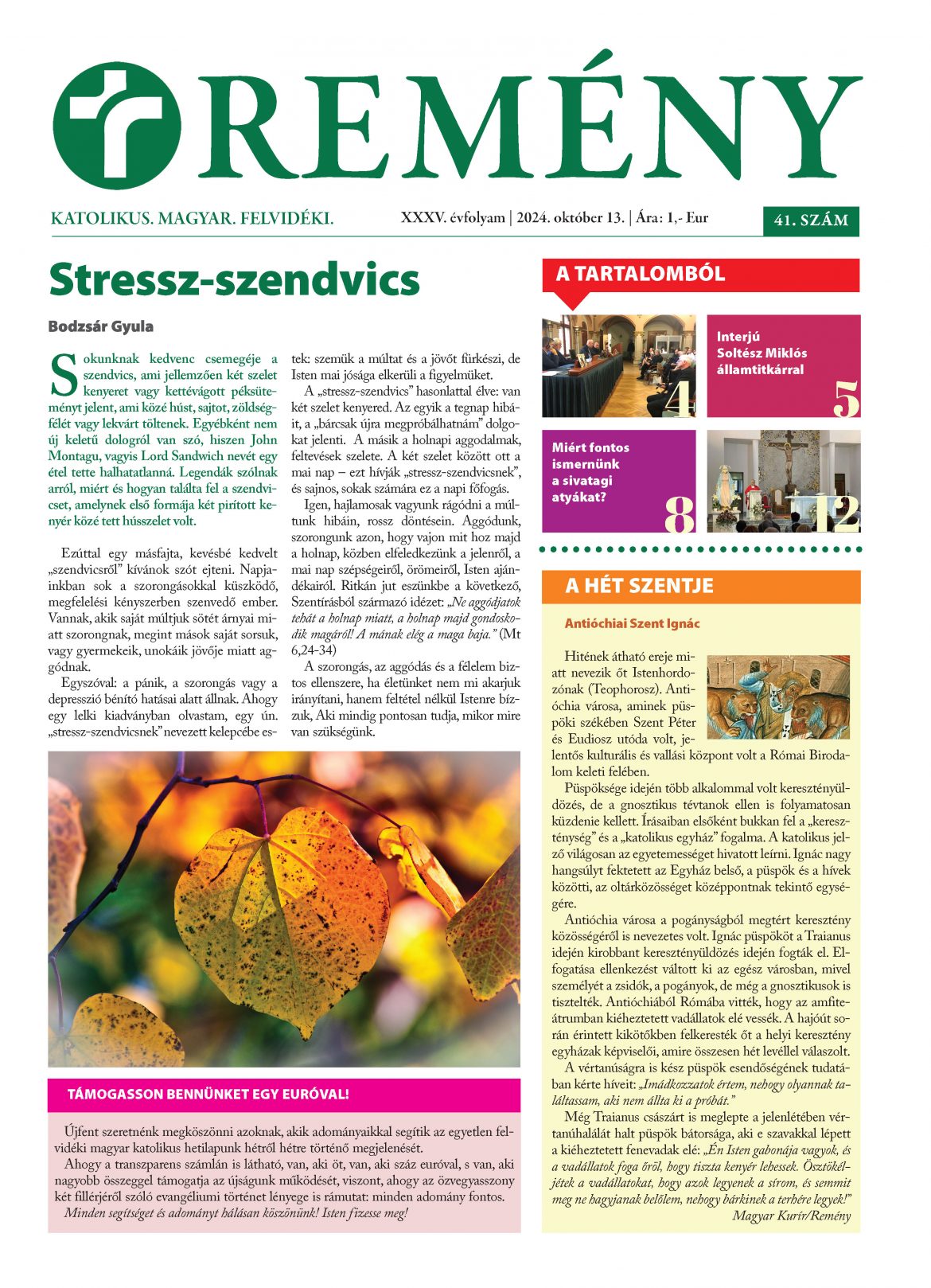 A Remény hetilap legújabb száma, amely október 13-án, évközi 28. vasárnap jelenik meg, ismét sok érdekes olvasnivalót kínál.