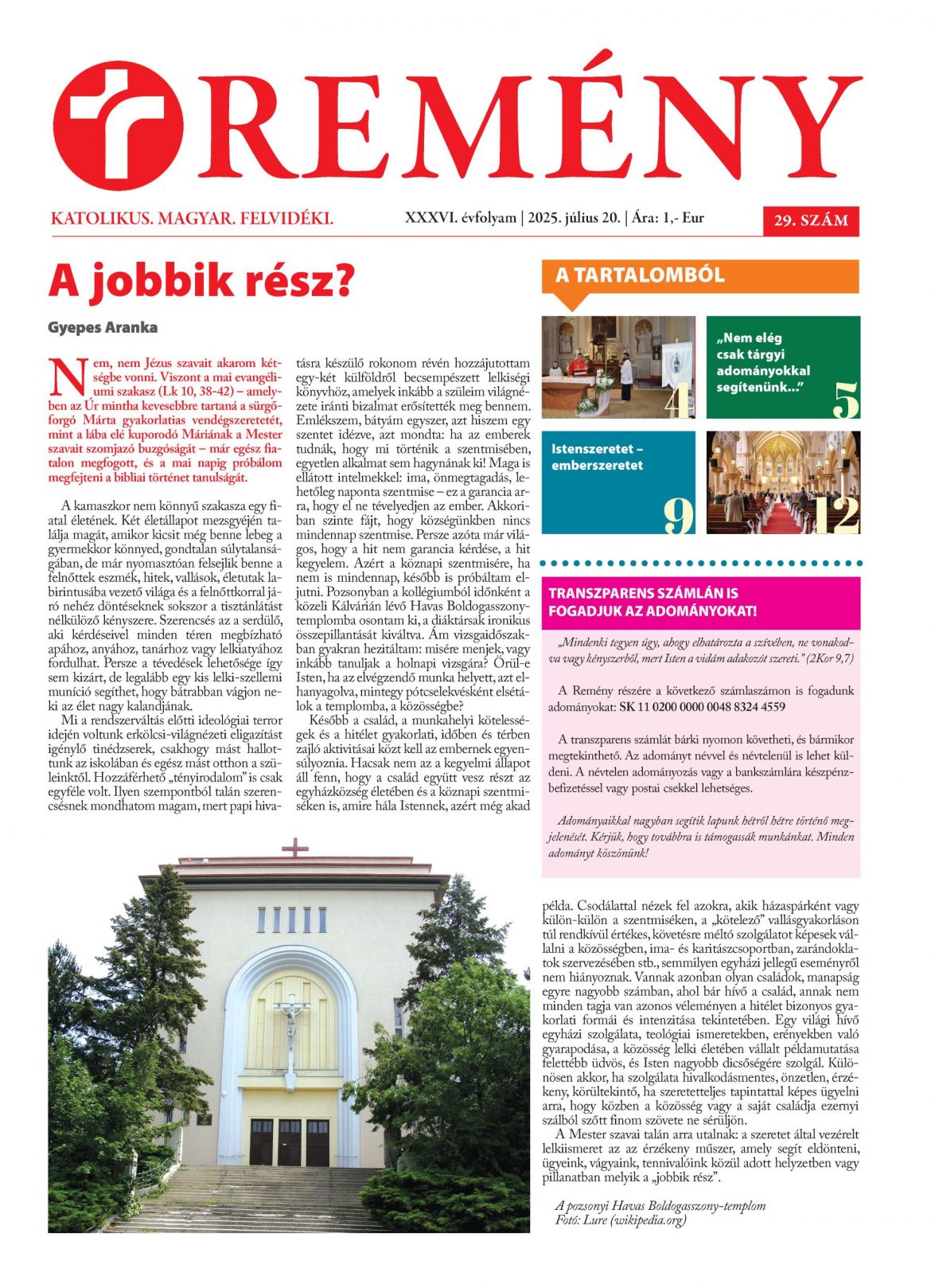 A Remény legújabb, július 20-i dátummal megjelenő számában az évközi idő 16. vasárnapjának igeliturgikus szövegeit és az azokhoz kapcsolódó, Zsidó János által írt igemagyarázatot olvashatják. Ugyancsak az aznapi evangéliumból, Mária és Márta történetéből indul ki A jobbik rész? című vezércikkében Gyepes Aranka.
