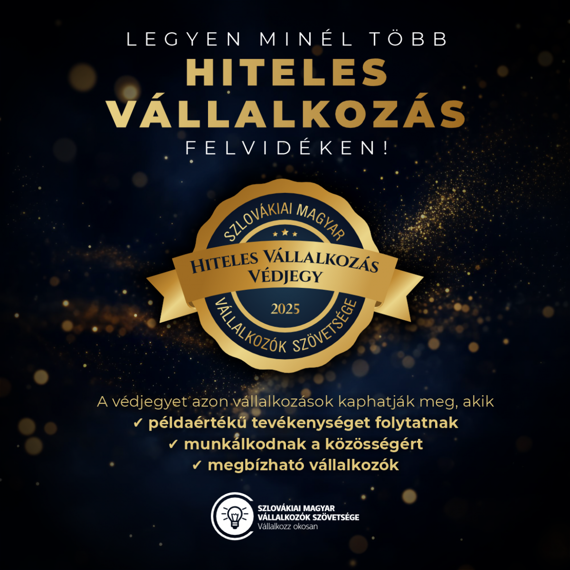 A Szlovákiai Magyar Vállalkozók Szövetsége 2022-ben alkotta meg a Hiteles Vállalkozás Védjegyet. 2025-ben negyedik alkalommal kerül odaítélésre azon vállalkozók részére, akik példaértékű tevékenységet folytatnak, munkálkodnak a közösségért és megbízható vállalkozók.