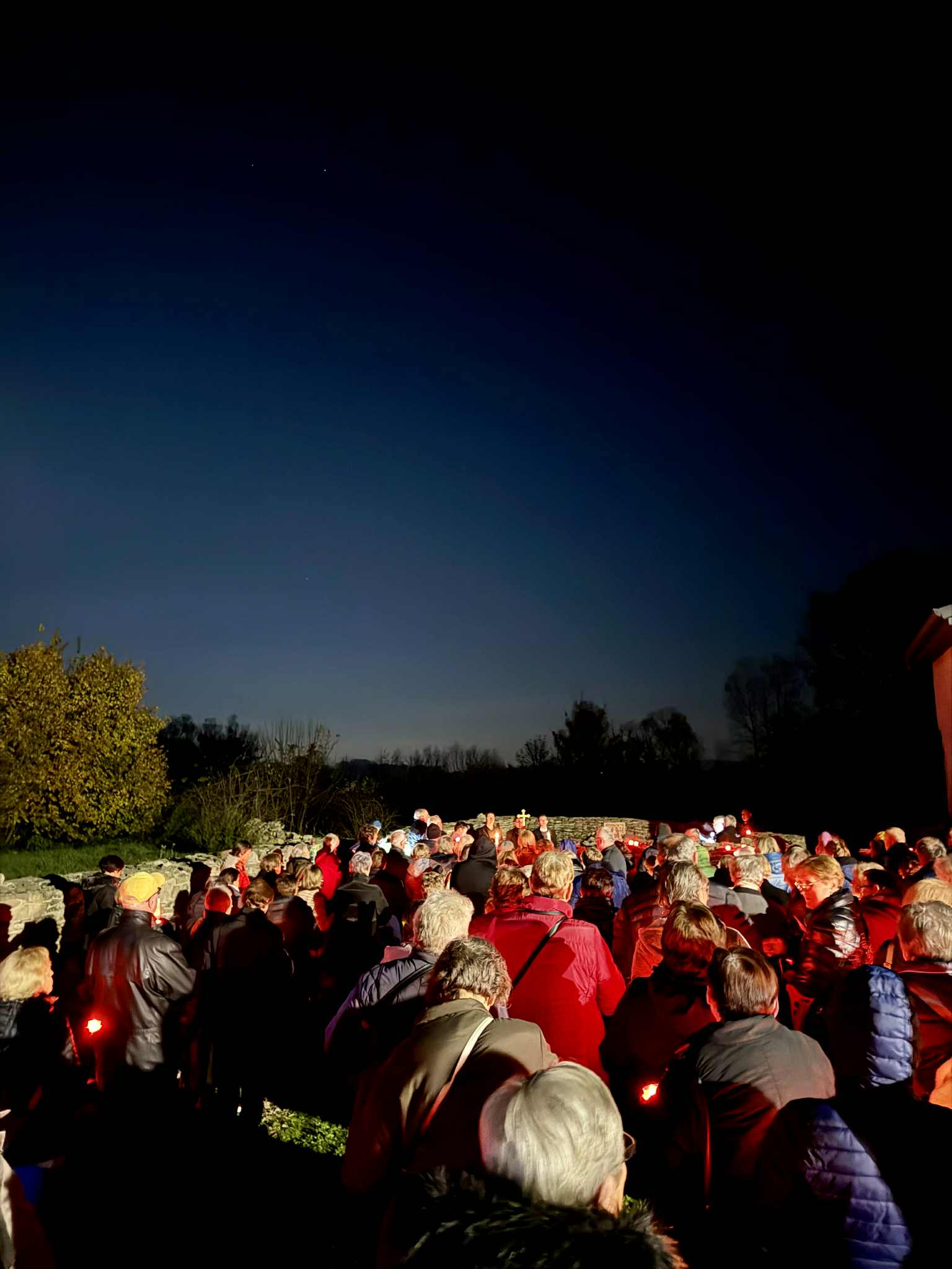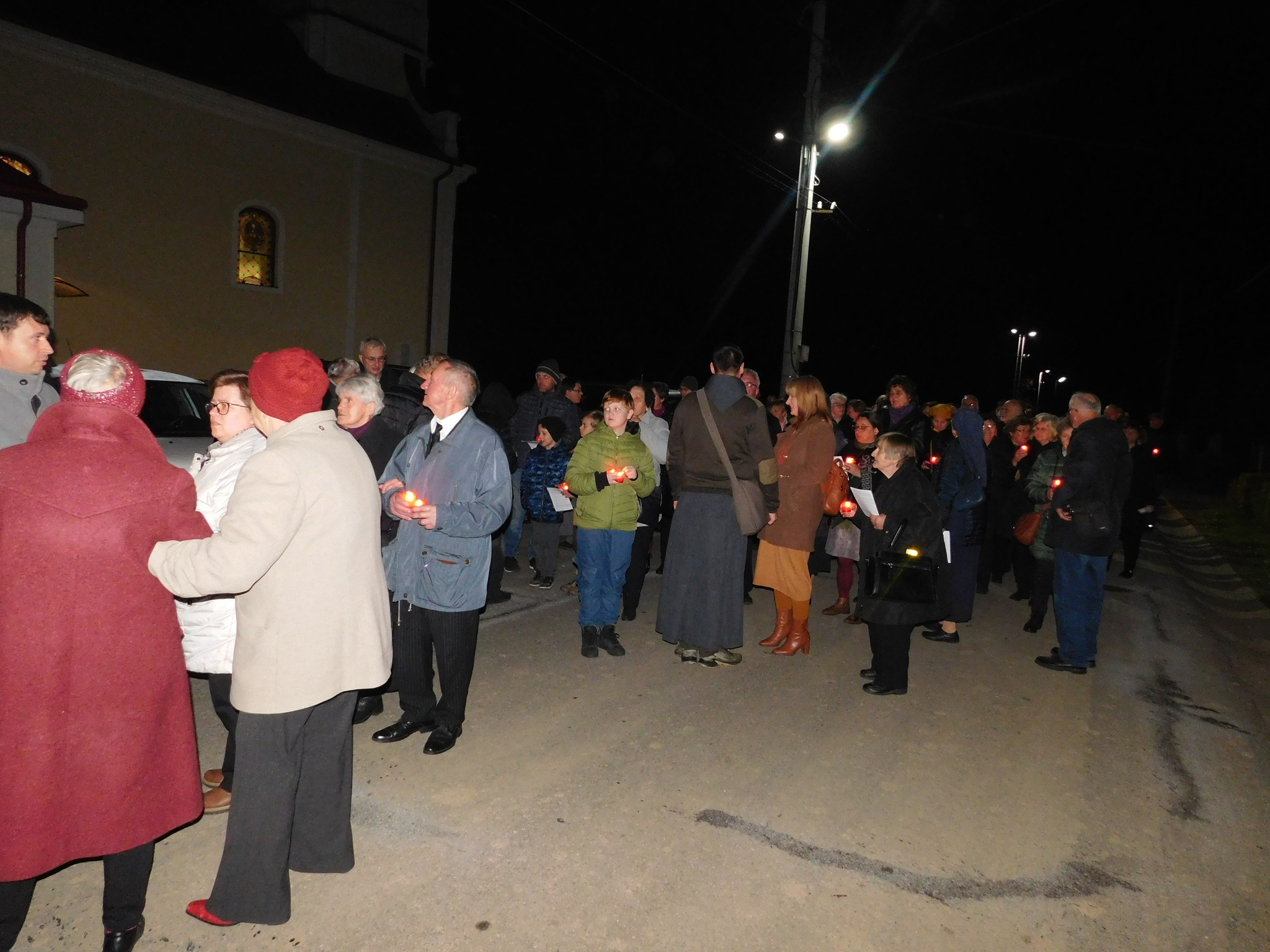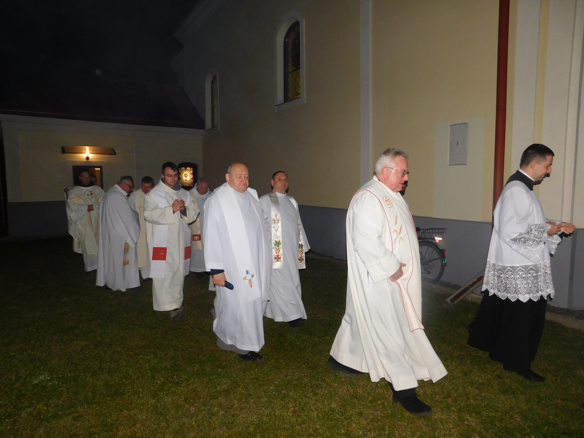 A szentmise befejezése után körmenet következett: a hívek kezükben mécsessel, énekelve vonultak a falu utcáján a plébánia udvarára, ahol a volt kápolna felújított romjai között imádkoztunk magyar és szlovák nyelven István testvér boldoggá avatásáért, valamint az ott újra eltemetett minorita atyák és hívek lelki üdvéért.