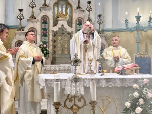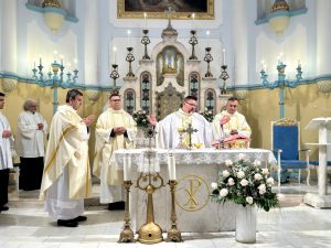 Az újmisés papi áldást követően a himnuszok következtek. Ezek imádságos éneklése különleges meghatódottsággal töltötte be a templomot, ugyanis a Magyar Nemzetőrség Török István Győr-Moson-Sopron Megyei Szövetségének tagjai által az egykori koronázóvárosba e szentmisére elhozott magyar Szent Korona hiteles másolata ünnepélyes módon a szentmise ezen részében a jelenlévők elé tartatott. A vendéglátó lelkipásztor, Molnár Tamás elmondta, a pápai és a magyar himnusz közös imádkozása figyelmeztet minket arra – mint ahogyan a II. Szilveszter római pápa által küldött Szent István-i korona is –, hogy hűségesnek kell maradnunk az Egyházhoz és a nemzetünkhöz, a hitünkhöz és nemzeti önazonosságunkhoz. Imádkozni a Szent Korona népeiért pedig minden esetben a békéért és kölcsönös tiszteletért való fohászkodásunkat is jelenti.
