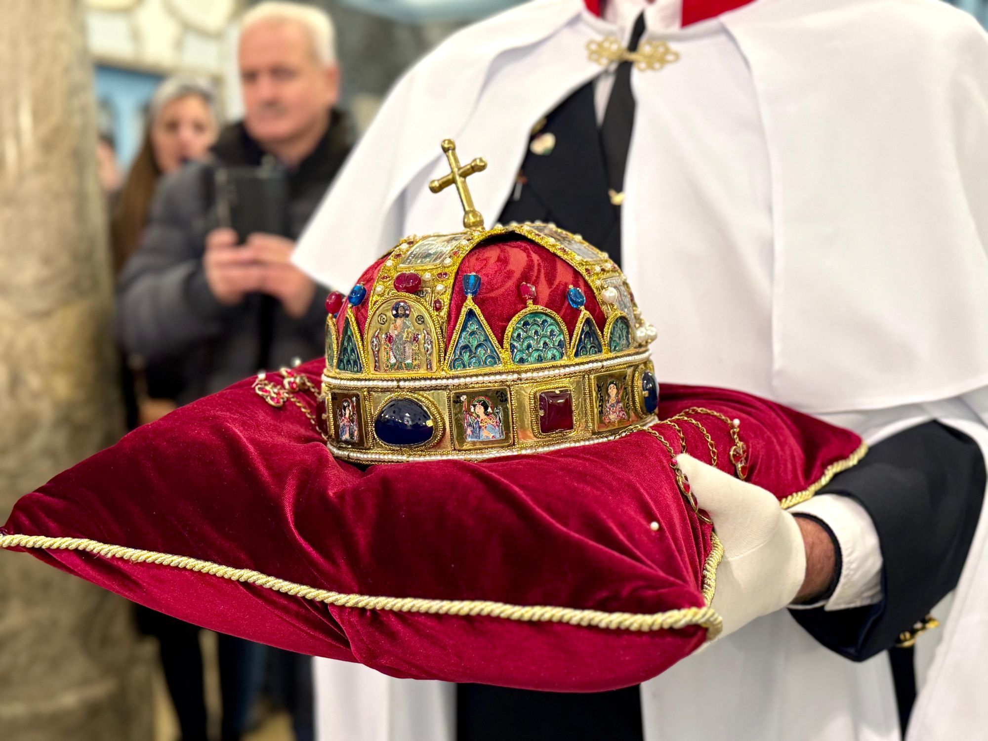 Az újmisés papi áldást követően a himnuszok következtek. Ezek imádságos éneklése különleges meghatódottsággal töltötte be a templomot, ugyanis a Magyar Nemzetőrség Török István Győr-Moson-Sopron Megyei Szövetségének tagjai által az egykori koronázóvárosba e szentmisére elhozott magyar Szent Korona hiteles másolata ünnepélyes módon a szentmise ezen részében a jelenlévők elé tartatott. A vendéglátó lelkipásztor, Molnár Tamás elmondta, a pápai és a magyar himnusz közös imádkozása figyelmeztet minket arra – mint ahogyan a II. Szilveszter római pápa által küldött Szent István-i korona is –, hogy hűségesnek kell maradnunk az Egyházhoz és a nemzetünkhöz, a hitünkhöz és nemzeti önazonosságunkhoz. Imádkozni a Szent Korona népeiért pedig minden esetben a békéért és kölcsönös tiszteletért való fohászkodásunkat is jelenti.