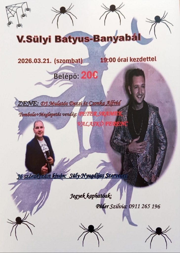 A szervezők és a Süly–Nyugdíjas Szervezet sok szeretettel vár minden érdeklődőt az V. Sülyi Batyus-Banyabálra, amelyre 2026. március 21-én, szombaton 19:00 órától kerül sor.