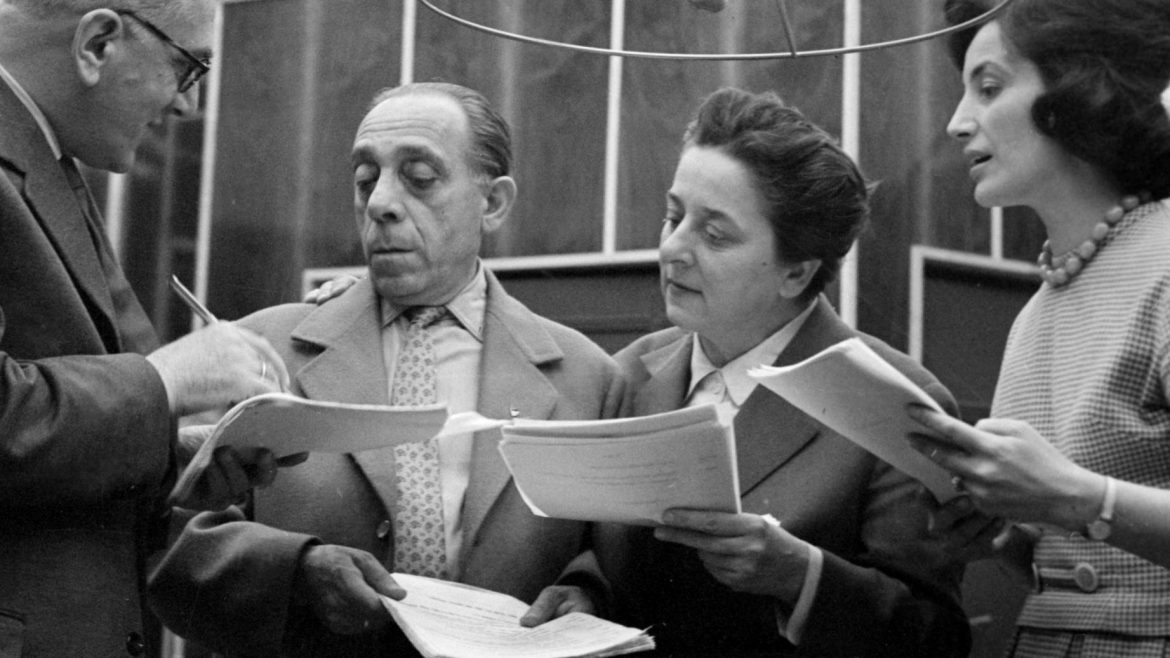 Szabó Ernő (jobb oldalon ül) 1960-ban, A Szabó család című rádiós szappanopera szereplőivel (Fotó: Wikipédia)