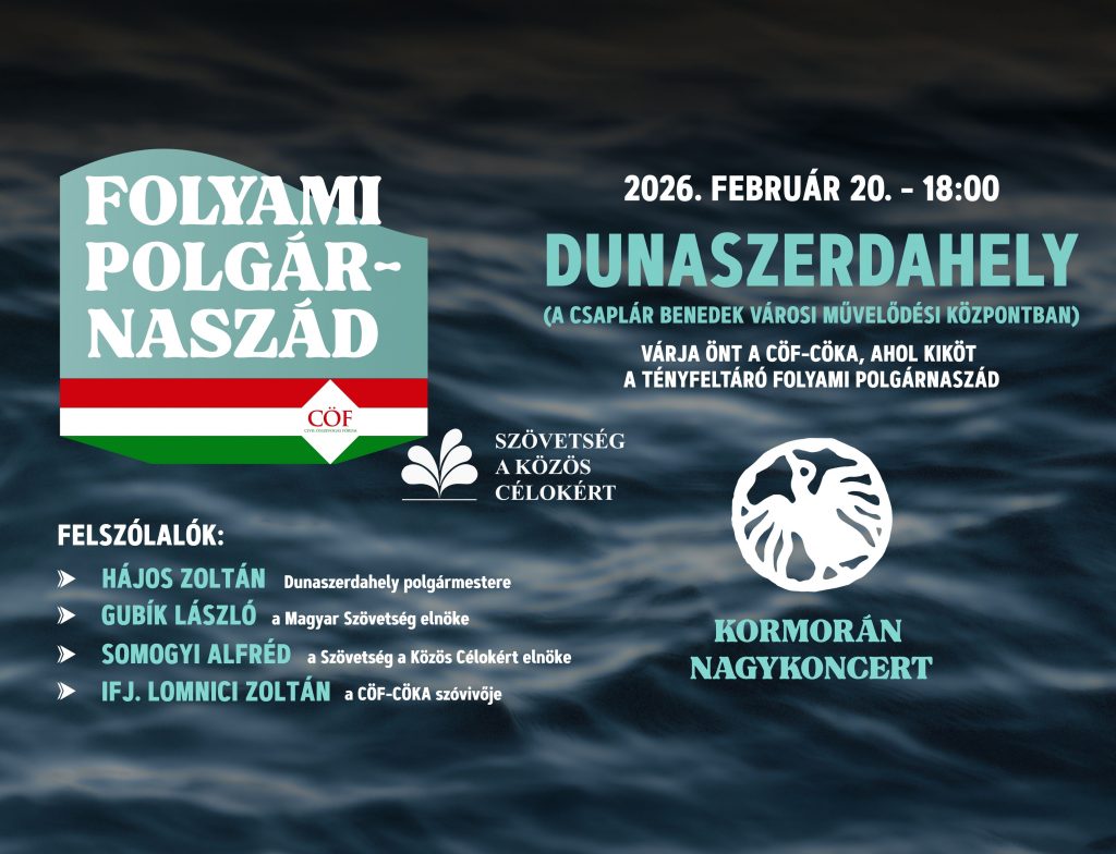 A Civil Összefogás Fórum és a Szövetség a Közös Célokért társulás közös szervezésében érkezik a Folyami Polgárnaszád programsorozat a Csaplár Benedek Városi Művelődési Központba, 2026. február 20-án, pénteken 18 órától.