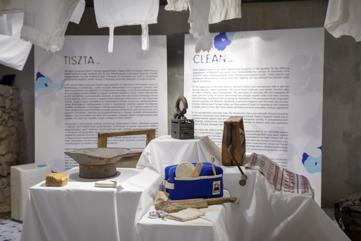 A Szabad szappanozni című kamara kiállítás az eltelt százötven év magyar tisztálkodási szokásait mutatja be. Már a cím is kifejező: a szervezők a maroskeresztúri gyermekdalra utalnak.