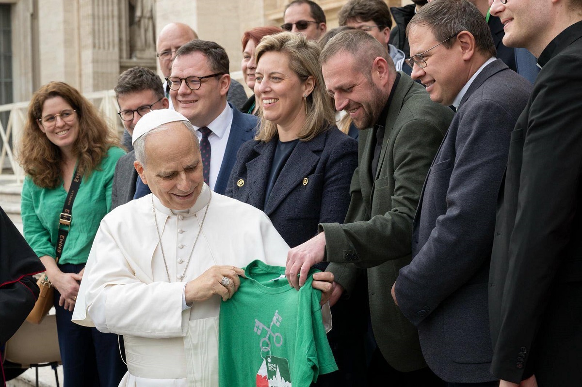 Farkas Zsolt atya átnyújtja Leó pápának a felvidéki ministránsok pólóját (Fotó: Jópásztor Alapítvány)