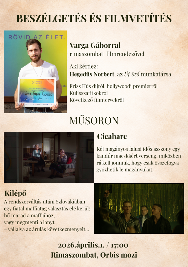 Április 1-jén 17 órakor a rimaszombati Orbis moziban filmvetítéssel egybekötött beszélgetés lesz a 12. Friss Hús Budapest Rövidfilmfesztivál „Legígéretesebb 30 év alatti rendező” díjával kitüntetett Varga Gáborral.