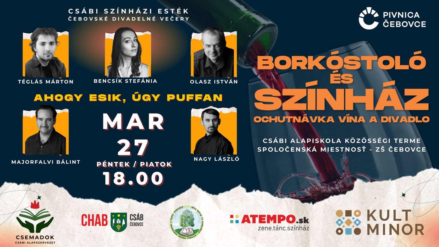 A jókedv, a minőségi borok és a közösségi találkozások élményét hozza el erre az estére a Csemadok Csábi Alapszervezete, Csáb község és a helyi alapiskola. A színházi előadás a Kisebbségi Kulturális Alap támogatásával valósul meg.