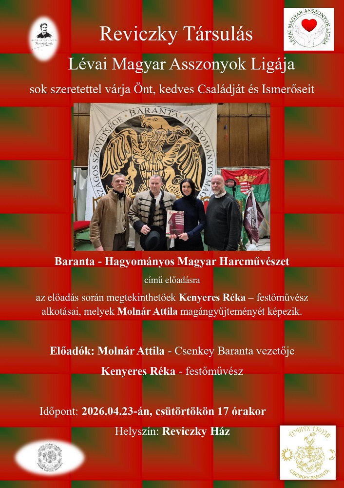 Április 23-án, csütörtökön 17.00 órai kezdettel szervezik meg a Baranta – Hagyományos Magyar Harcművészet című előadást a lévai Reviczky Házban.