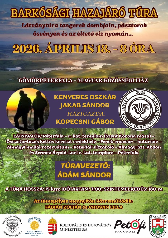 Április 18-án, szombaton 8.00 órai kezdettel szervezik meg a Barkósági Hazajáró Túrát , találkozó a gömörpéterfalai Magyar Közösségi Háznál.
