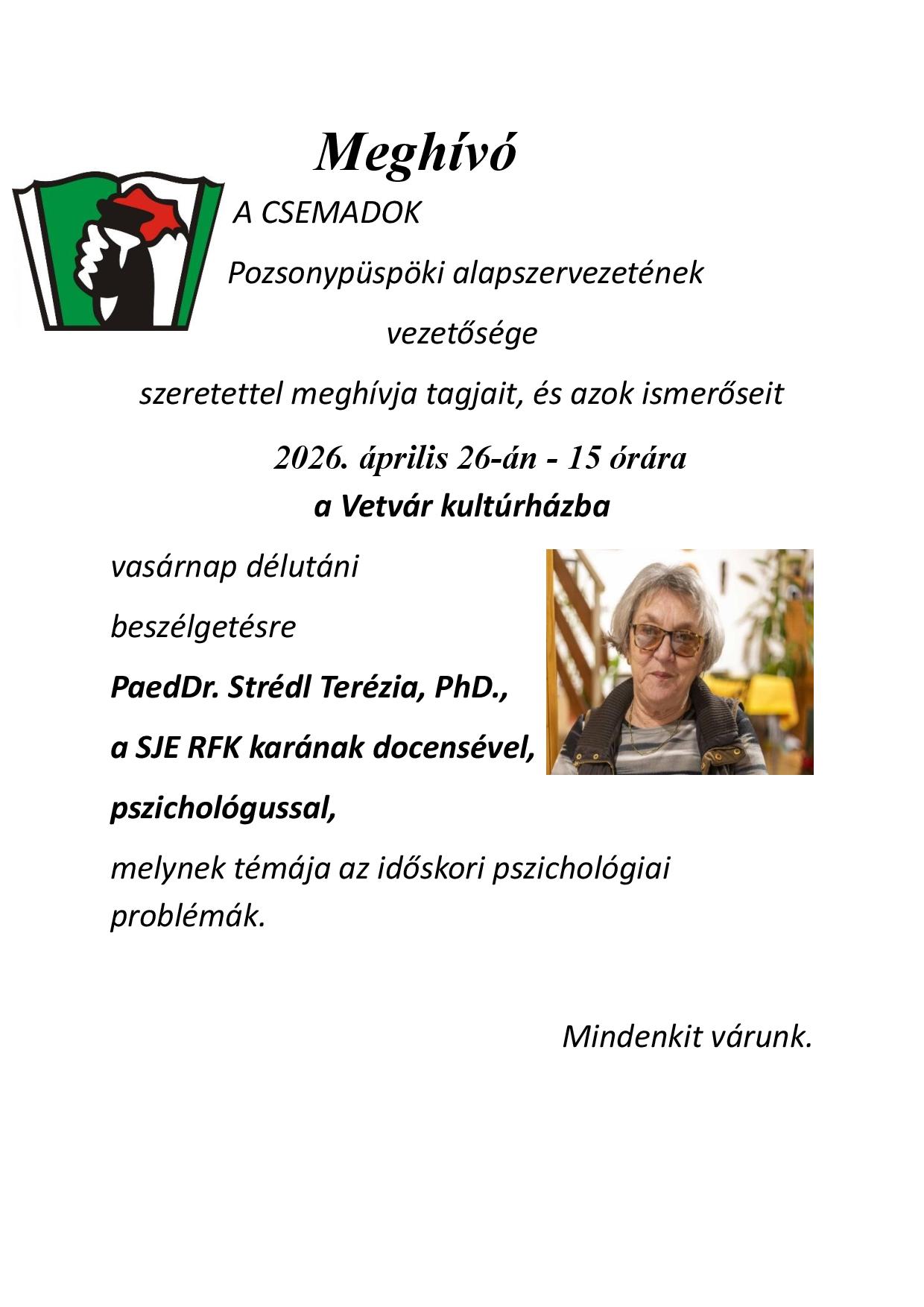 Áprilisi 26-án, vasárnap 15.00 órai kezdettel szervezik meg a beszélgetést Strédl Teréziával a Vetvár kultúrházban.