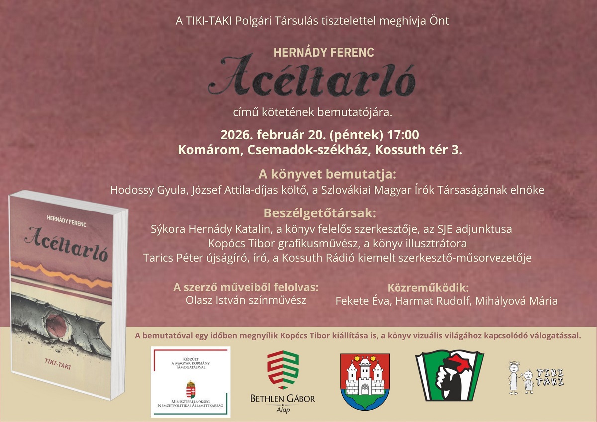 Február 20-án, pénteken 17.00 órai kezdettel szervezik meg Hernády Ferenc Acéltartó című kötetének bemutatóját a komáromi Csemadok székházban.