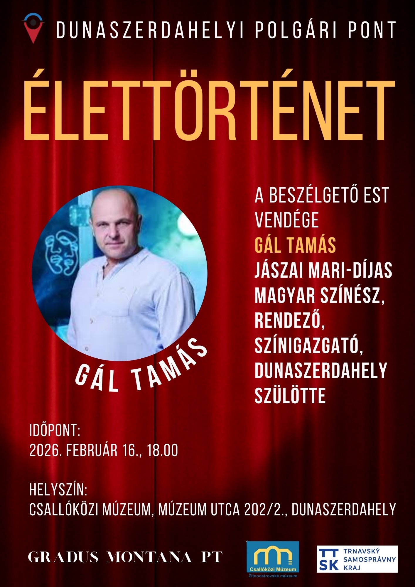 A Gradus Montana Polgári Társulás és a Csallóközi Múzeum 2026. február 16-án folytatja a Dunaszerdahelyi Polgári Pont ÉLETTÖRTÉNET című közös rendezvénysorozatát, amelynek vendáge Gál Tamás. A rendezvénysorozat azokat…
