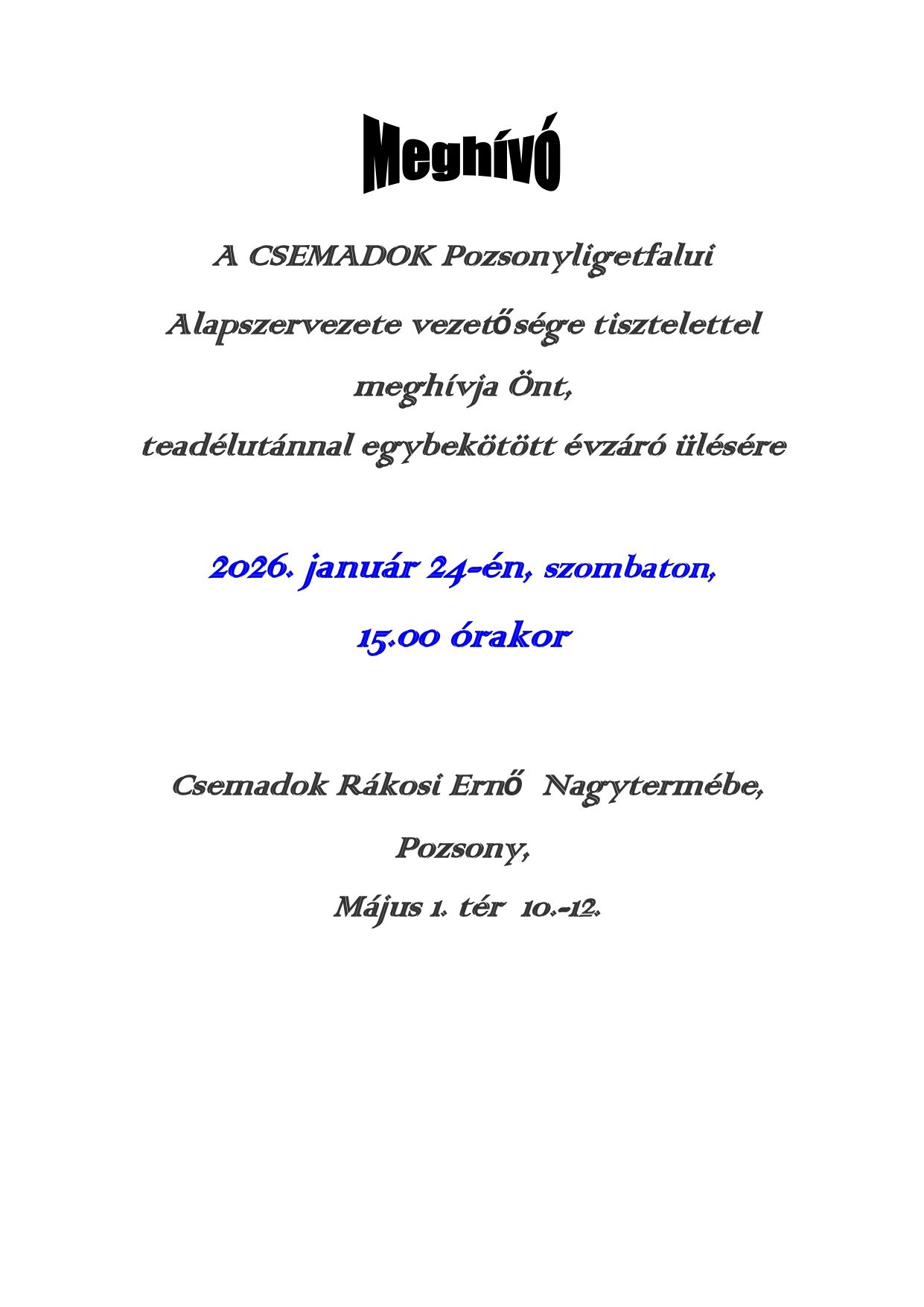 A Csemadok Tamásfalvai Alapszervezete, Rimaszombat városrészében a Haranglábnál tartja évzáró taggyűlését 2026. február 28-án, 16.00 órai kezdettel.