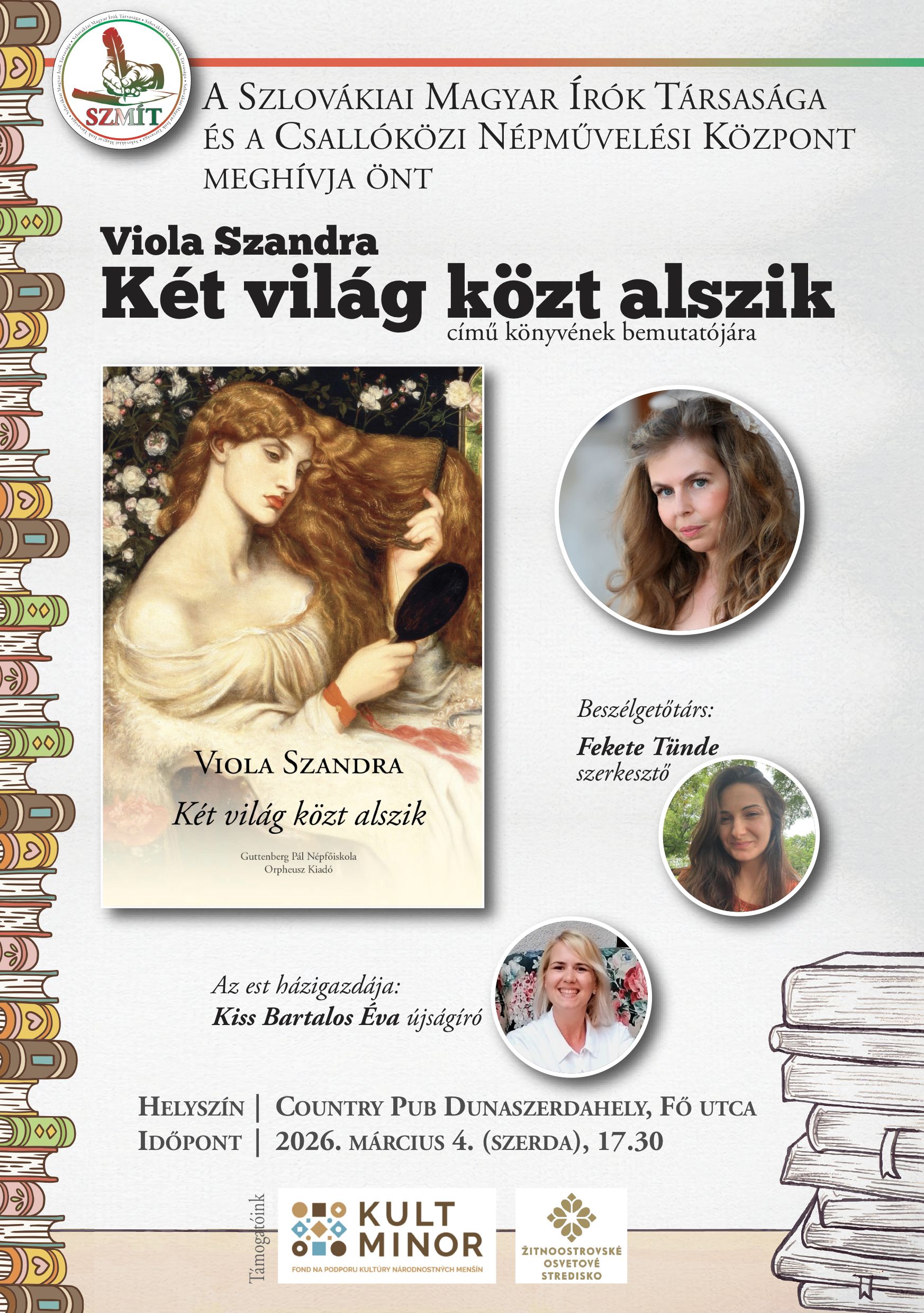 Március 4-én, szerdán 17.30 kezdettel szervezik meg Viola Szandra Két világ közt alszik című kötet bemutatóját a dunaszerdahelyi Country Pubban.