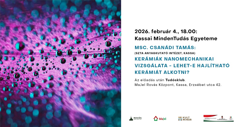 Február 4-én, szerdán 18.00 órai kezdettel szervezik meg MSc. Csanádi Tamás Kerámiák nanomechanikai vizsgálata - lehet-e hajlítható kerámiát alkotni? című előadását a kassai MaJel Rovás Központban. A Kassai MindenTudás…