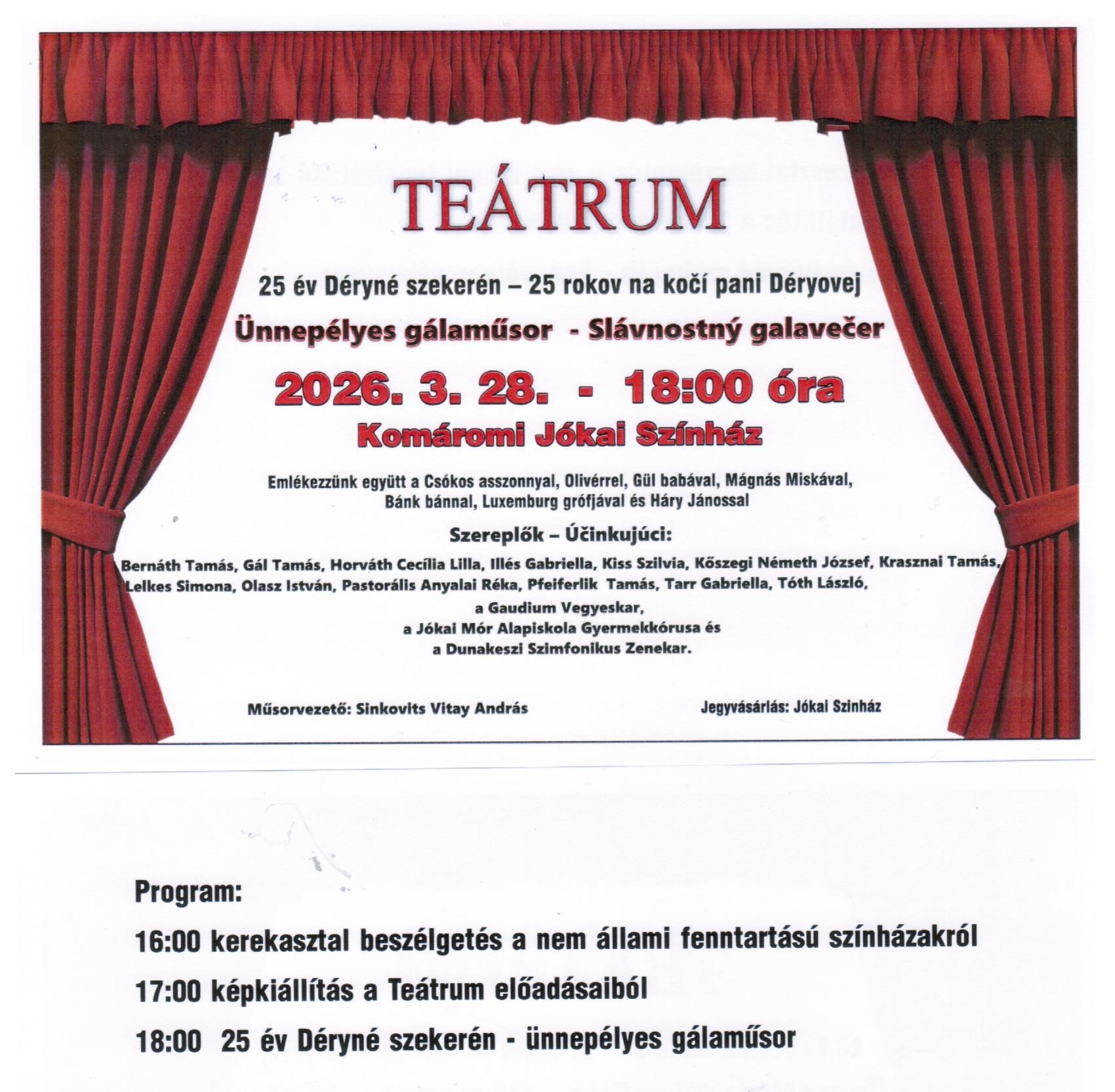 Március 28-án, szombaton 18.00 órai kezdettel szervezik meg az 25 év Déryné szekerén – ünnepélyes gálaműsort a Komáromi Jókai Színházban. A részletes program a plakáton olvasható.
