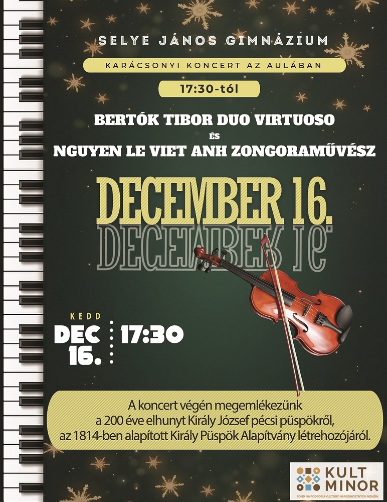 Selye János GimnáziumDecember 16-án, kedden 17.30 kezdettel szervezik meg a karácsonyi koncertet a Selye János Gimnázium aulájában. Fellépnek: a Bertók Tibor Duo Virtuoso és Nguyen Le Viet Anh zongoraművész.…