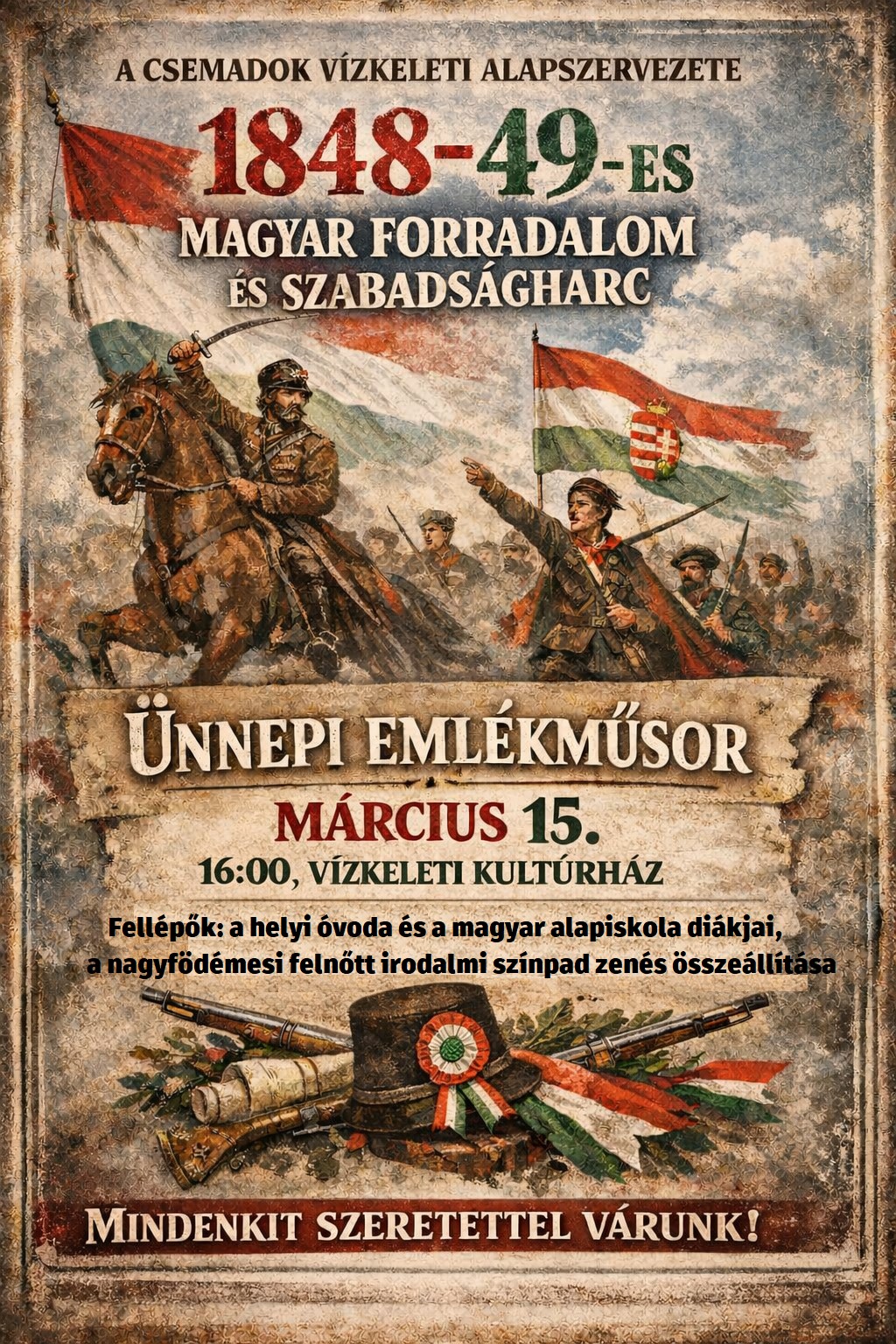 Március 15-én, vasárnap 16.00 órai kezdettel szervezik meg az 1848/49-es forradalom és szabadságharc évfordulója alkalmából szervezett ünnepi emlékműsort a vízkeleti kultúrházban.