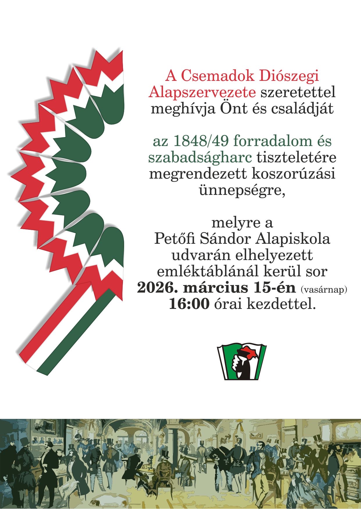 Március15-én, vasárnap 16.00 órai kezdettel szervezik meg az 1848/49-es forradalom és szabadságharc évfordulója alkalmából szervezett megemlékezést a diószegi Petőfi Sándor Alapiskola udvarán.