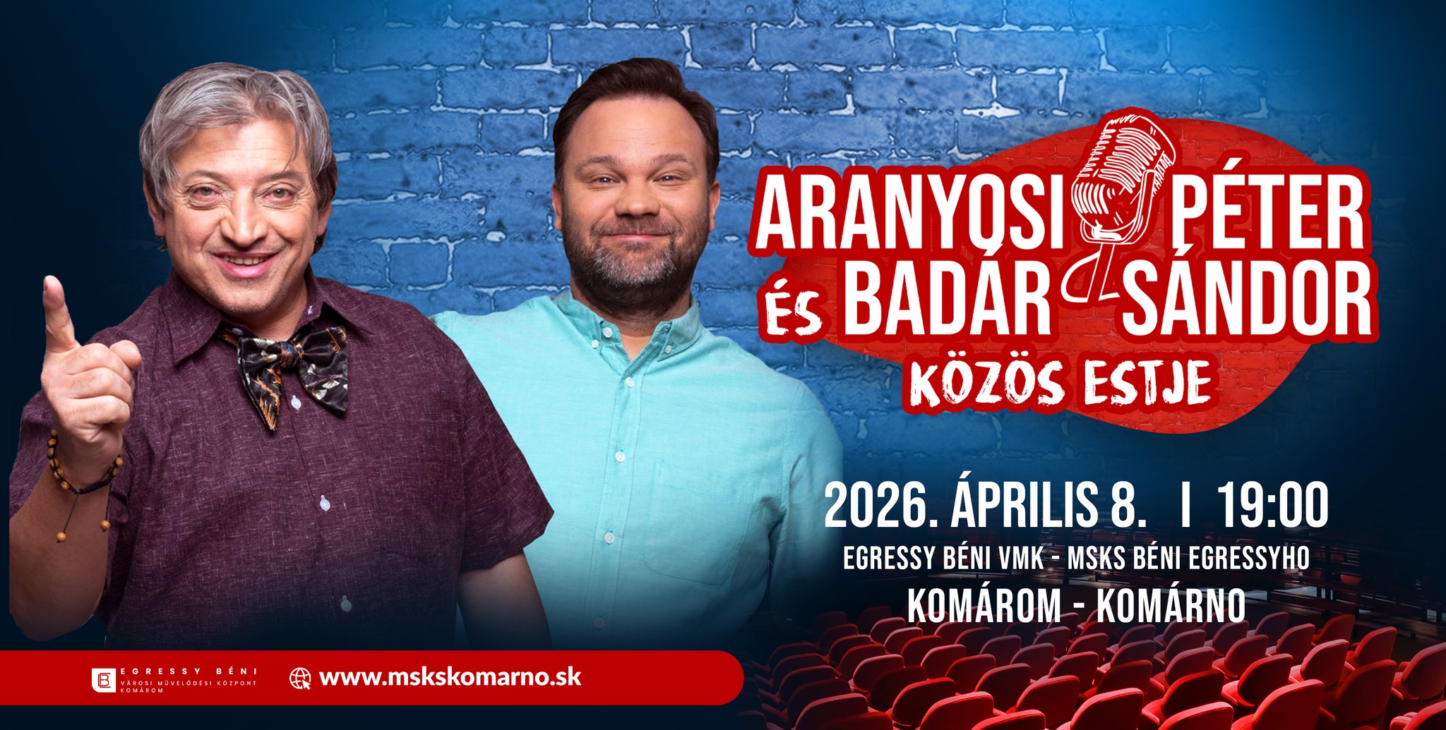 Április 8-án, szerdán 19.00 órai kezdettel szervezik meg Aranyosi Péter és Badár Sándor közös estjét a komáromi Egressy Béni Városi Művelődési Központban.