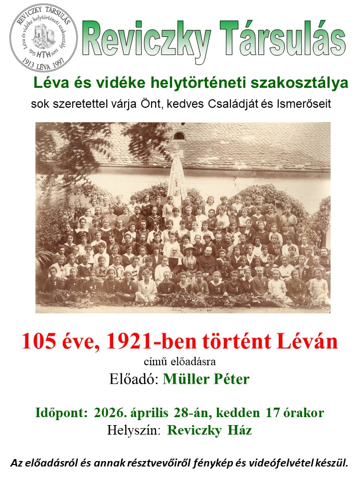 Április 28-án, kedden 17.00 órai kezdettel szervezik meg Müller Péter 105 éve, 1921-ben történt Léván című helytörténeti előadását a lévai Reviczky Házban.