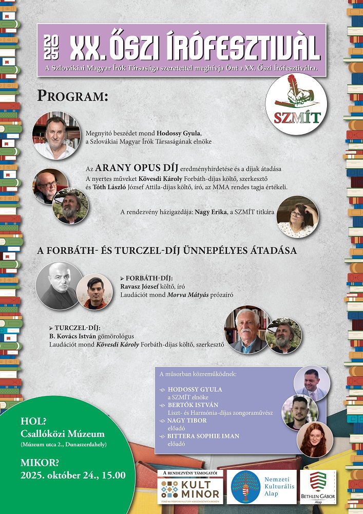A Szlovákiai Magyar Írók Társasága október 24-én, pénteken 15.00 órai kezdettel szervezi meg a XX. Őszi Írófesztivált a dunaszerdahelyi Csallóközi Múzeumban.